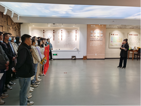 参观结束后,同学们整齐列队,洪芳、胡卫东与同学们一起齐声合唱《国际歌》。此次校史展参观,同学们表现极大的热情,纷纷表示愿意在党团学习和实践的平台上,增进友谊、加强交流、更好成长!