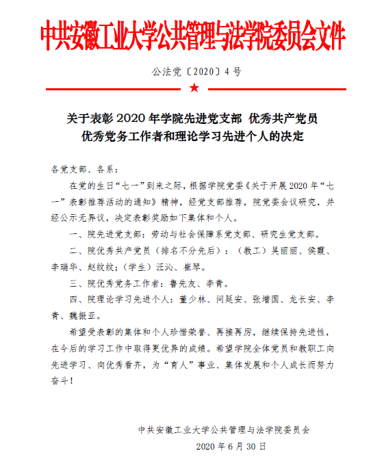 关于表彰2020年学院先进党支部优秀共产党员优秀党务工作者和理论学习先进个人的决定