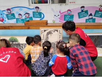 志愿者们在幼儿园老师引导下,首先组织开展了识国旗教育活动,通过PPT展示向幼儿园小朋友介绍国旗的构成元素以及各部分所代表的重要意义,让他们更加直观的了解国旗。在互动环节中,小朋友们踊跃回答问题,现场气氛较为活跃。紧接着,志愿者们向小朋友们讲述了《小萝卜头》、《小红军》等红色故事。最后,志愿者们组织了“不忘初心,牢记使命”主题观画展活动,通过一幅幅画作来传递爱国意识,表达了对先辈的赞扬之情。小朋友们仔细地欣赏着每一幅画,并就画中各部分所代表的含义展开讨论,活动在欢声笑语中画上完美句号。