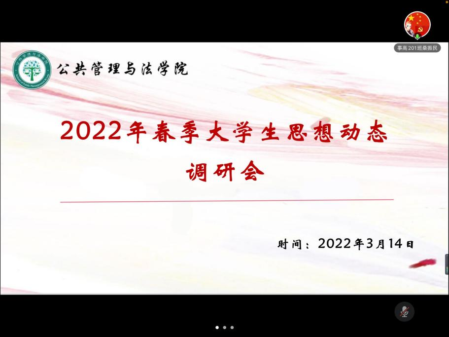 3月14日下午,公法学院于线上召开了2022年春季开学大学生思想动态调研会,各年级各专业学生代表参加。