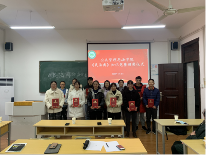 2022年1月4日下午,公法学院在本部公法楼201举行首届“未来律师杯”《民法典》竞赛颁奖典礼,学院院长徐济益、党委副书记、学生工作副院长李萍、教学副院长孔东菊、科研副院长杨哲出席会议,法学系师生百余人参加,法学系系主任徐刚主持。