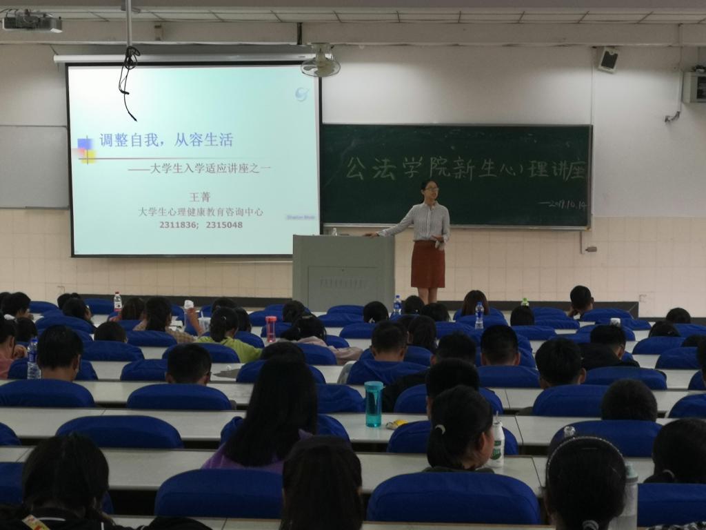 于校秀山校区阶一教102室举办了主题为“调整自我,从容生活”的新生心理讲座。院心理站负责人王菁老师应邀出席并担任主讲人,公法学院19级全体学生到场。