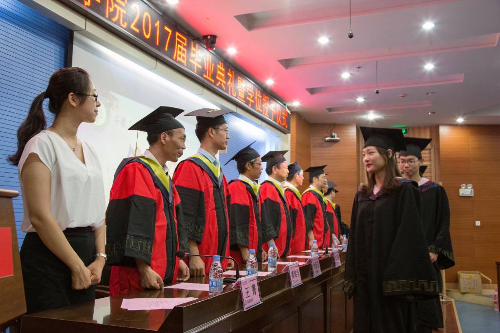 本科毕业生学士学位的决定》。校院领导依次为获奖学生颁发了荣誉证书,为毕业生代表颁发了毕业证书和学位证书,并为所有毕业生授予学位。教师代表袁同成、毕业生代表黄任东先后在典礼上发言。