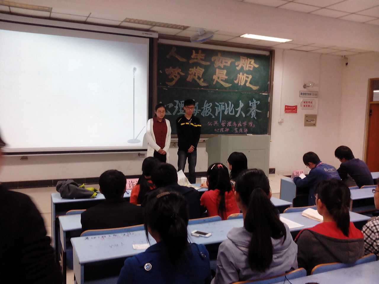 在教南208举办了“人生如船,梦想是帆”心理海报评比大赛。校心理中心老师刘海英以及院团委工作负责人和院相关老师出席了本次比赛。