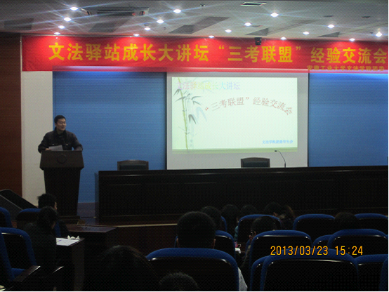 为了让我校学生在未来有一个明确的发展方向,解答他们对即将来临的各种考试的疑虑,公法学院于3月23日下午2:30在图书馆第一报告厅举办了此次公法驿站成长大讲坛——“三考联盟”经验交流会,并请来了老师和“三考”成功的师兄师姐就同学们的困惑和选择进行指引。