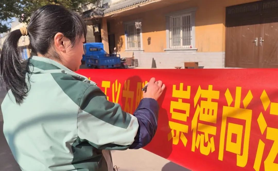 下午2时,参与者们集结在村广场,活动组织者进行简要的活动说明,并分发宣传材料和签名笔。随后,以普法知识宣讲内容为主题的宣传横幅被展示在村广场,并吸引了众多村民的关注。横幅上“律法为枪,正义为膛”的口号掷地有声,“崇德尚法,公为天下”的公法学院院训更是让村民们为之赞叹。