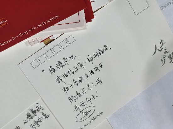 同学们在精致的明信片上写下对2024年的总结,并表达对新的一年的期许。一张张明信片承载着大家美好的祝福与期望。