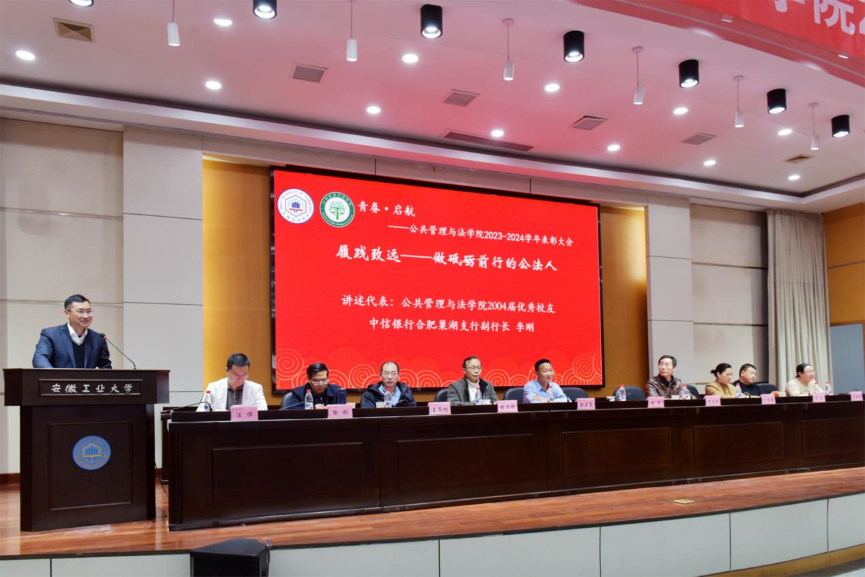 教师代表卢成会以“弘道毓英——做行为世范的公法人”为主题,分享了自己多年的教学感悟。他表示,作为教师,不仅要传授专业知识,更要以身作则,引导学生树立正确的价值观和职业道德观。在教学过程中,他始终密切关注学生的成长需求,用耐心和爱心去点燃学生心中的求知之火。优秀校友、中信银行合肥巢湖支行副行长李刚则围绕“履践致远——做砥砺前行的公法人”展开分享。他详细回顾了自己从校园走向职场的历程,分享了如何将公法专业知识应用于实际工作,以及在面对困难与挫折时,如何坚守初心、砥砺前行。他鼓励学弟学妹勇敢走出舒适区,在实践中积累经验,实现个人价值。