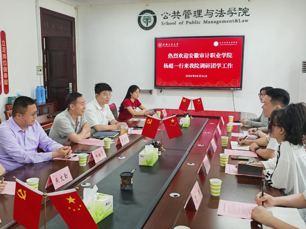 6月4日上午,安徽审计职业学院团委负责同志杨超、团委工作人员彭清露、师生代表一行,应邀前往公法学院开展团学调研工作。双方在公法楼402会议室举行团学工作交流活动,公法学院党委副书记、纪委书记、学生工作副院长周浩然,团学工作负责人钱前及师生代表共同参与交流。