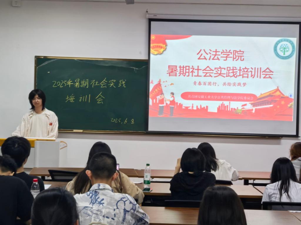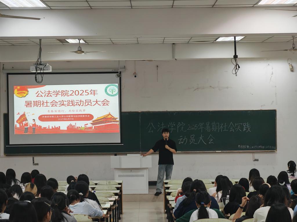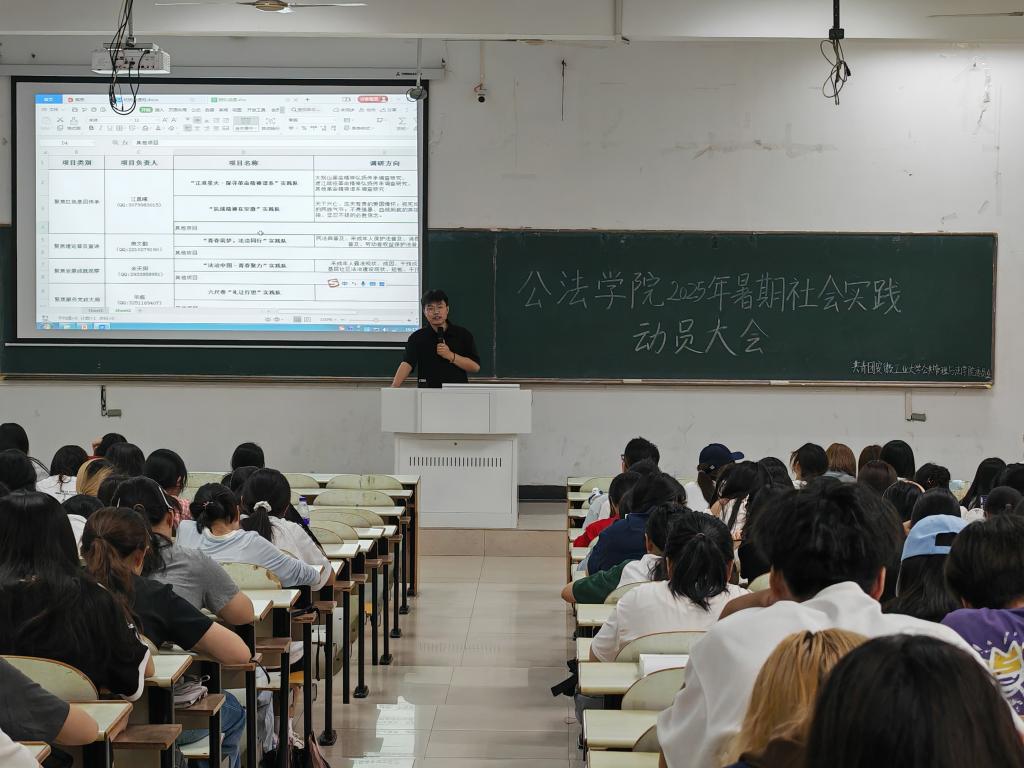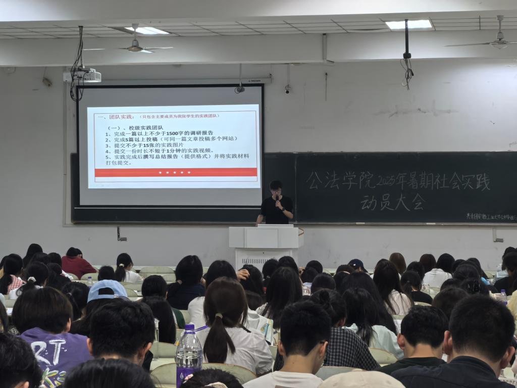 为响应我校及院团委的号召,组织同学们参与暑假社会实践,提升同学们的实践能力和综合素质,公法学院于6月8日晚在公法楼205室开展暑期社会实践培训活动,并于6月9日晚于教三南203开展2025年暑期社会实践动员大会。活动由工作人员张子旭、余天阳主持,团学工作负责人钱前发表讲话,各年级同学积极参与。