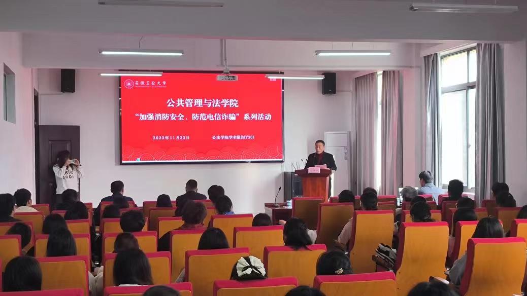 在公法楼学术会议中心301室举办一场以“加强消防安全,防范电信诈骗”为主题的宣讲活动。公法学院师生100余人出席,活动由公法学院党委副书记、副院长周浩然主持。
