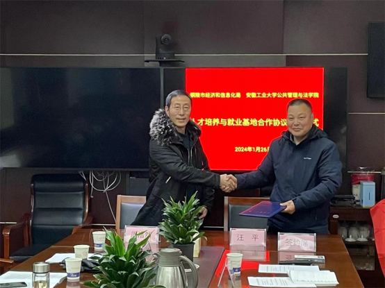 铜陵市应急管理局党委书记、局长王伟栋,党委委员、总工程师胡谦;经济与信息化局党组书记、局长李勇,党组成员、副局长汪平等领导热情接待了学院领导老师一行,并共同参加双方人才培养与就业基地合作协议签约暨揭牌仪式。