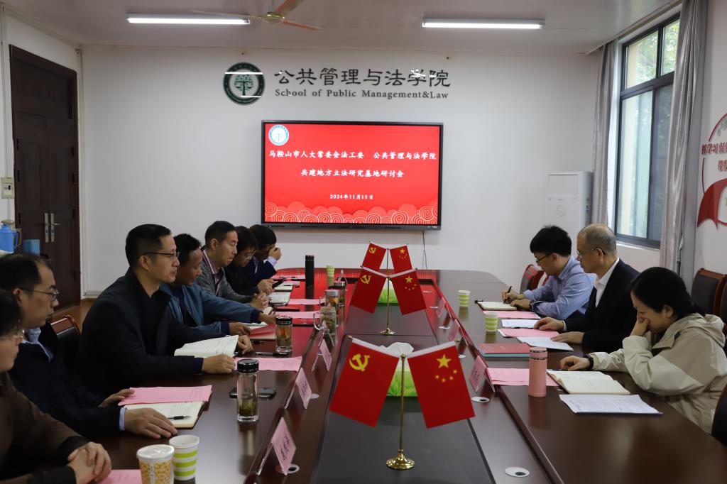 公法楼402室就共建地方立法研究基地进行交流。马鞍山市人大常委会法工委主任、二级巡视员任仕金,副主任、一级调研员喻林红,法工委办公室主任王龙、赌博